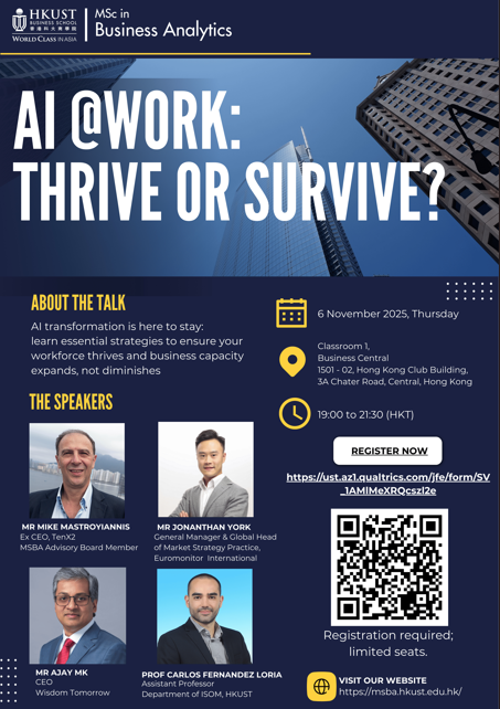 The HKUST MSc in Business Analytics Program was honored to host a thought-provoking enrichment talk titled "AI @ Work: Thrive or Survive?" on 6 November 2025.
