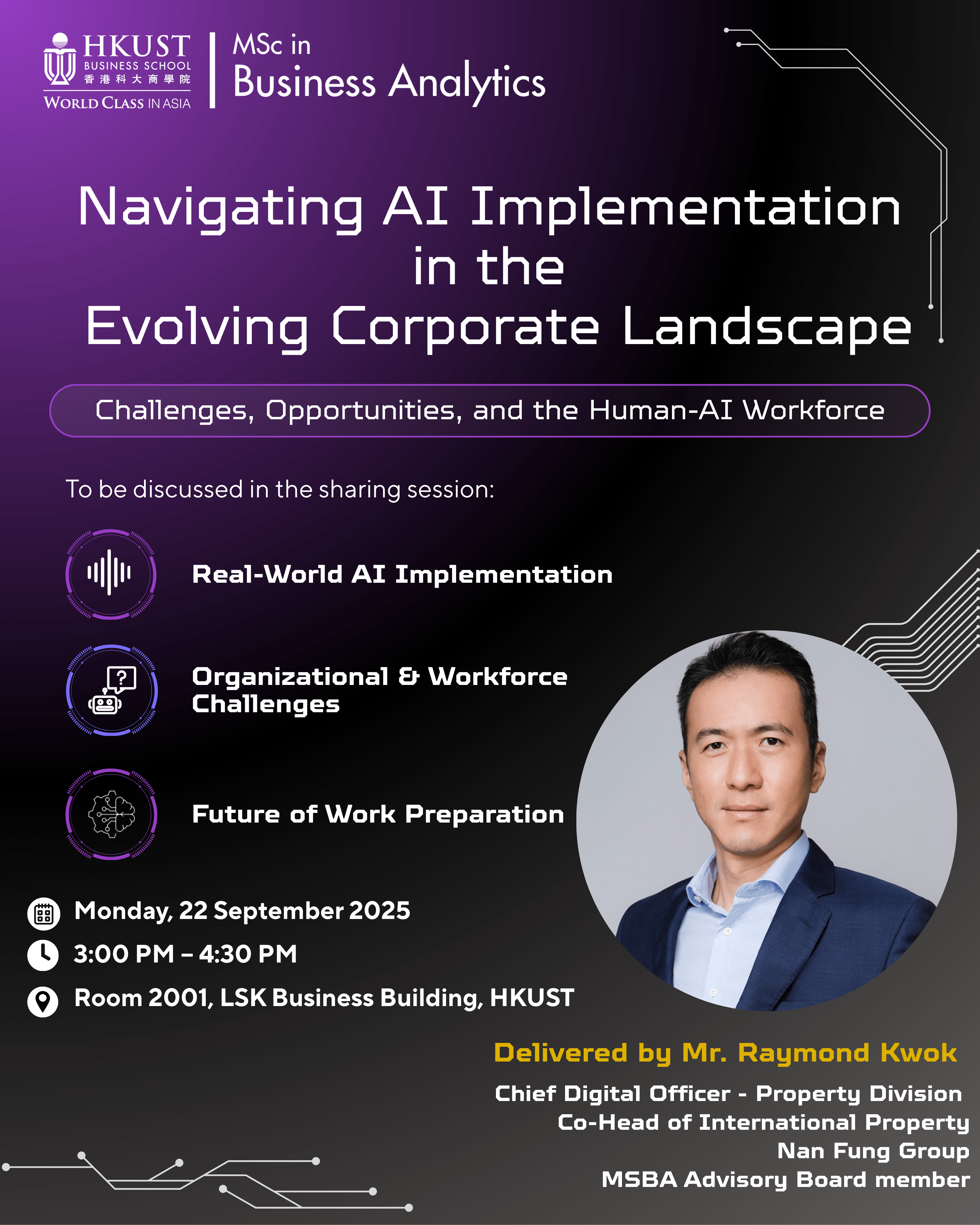 The HKUST MSc in Business Analytics Program was pleased to host Mr. Raymond Kwok, the MSBA Corporate Advisory Board Member, for an enrichment talk on AI implementation in the evolving corporate landscape.